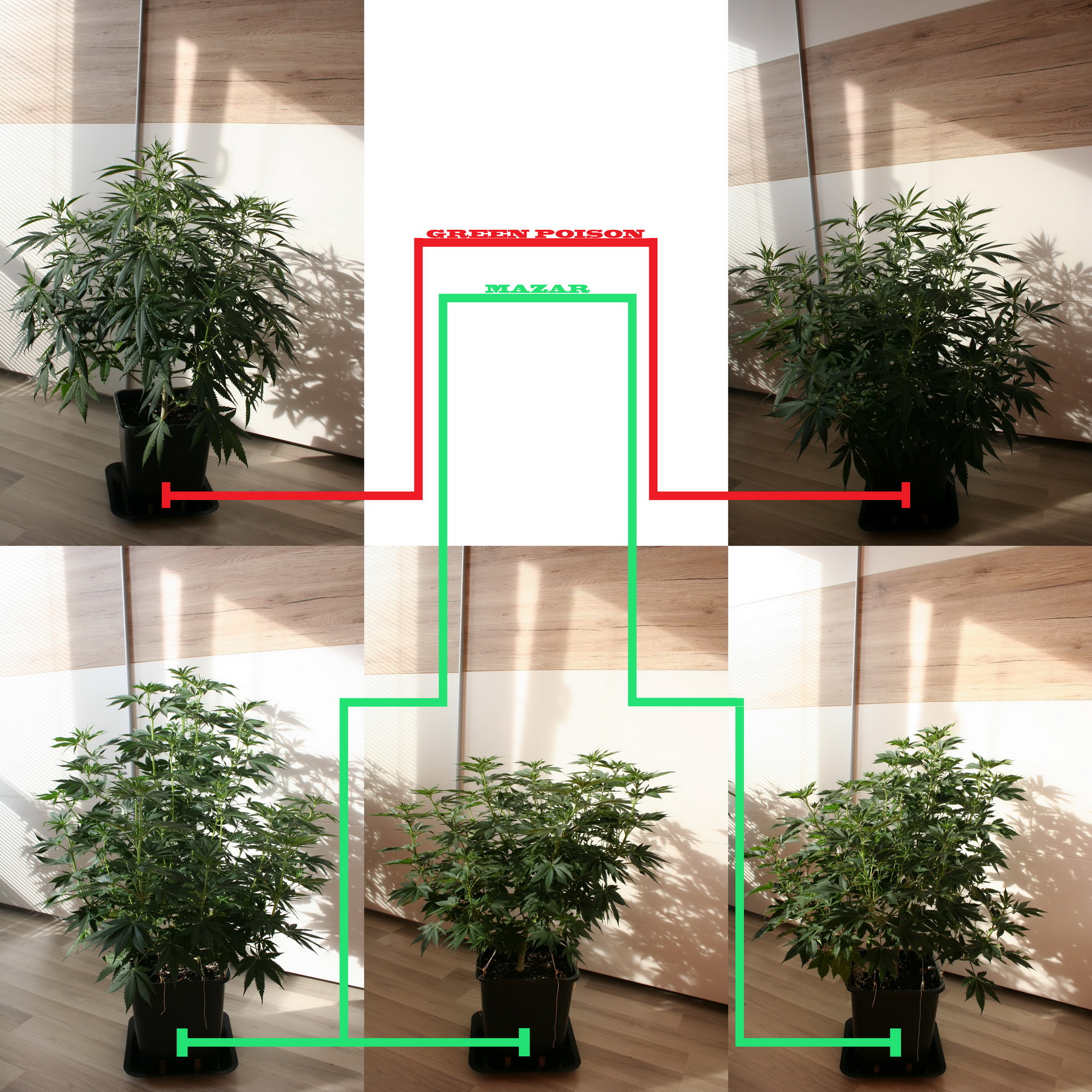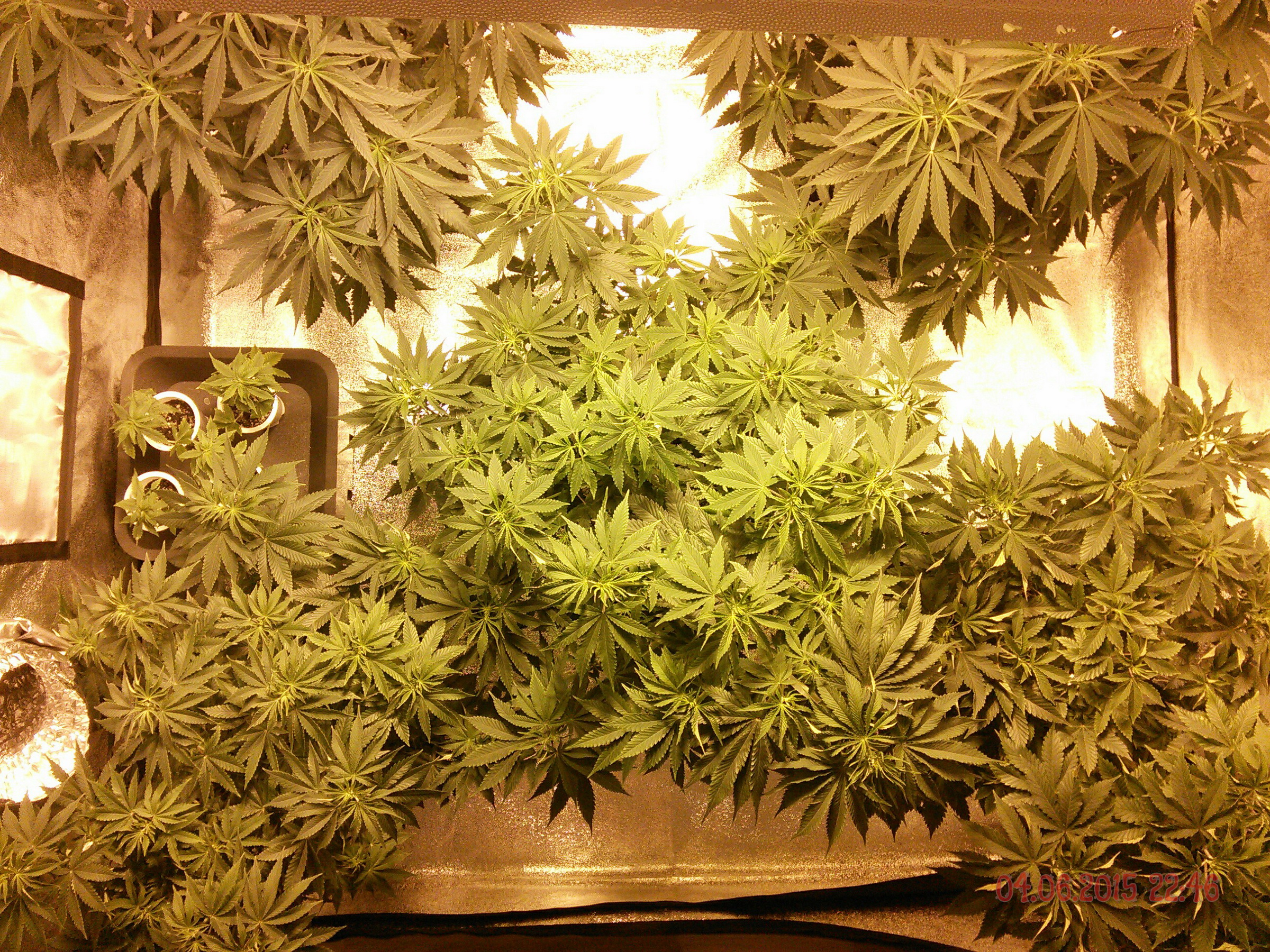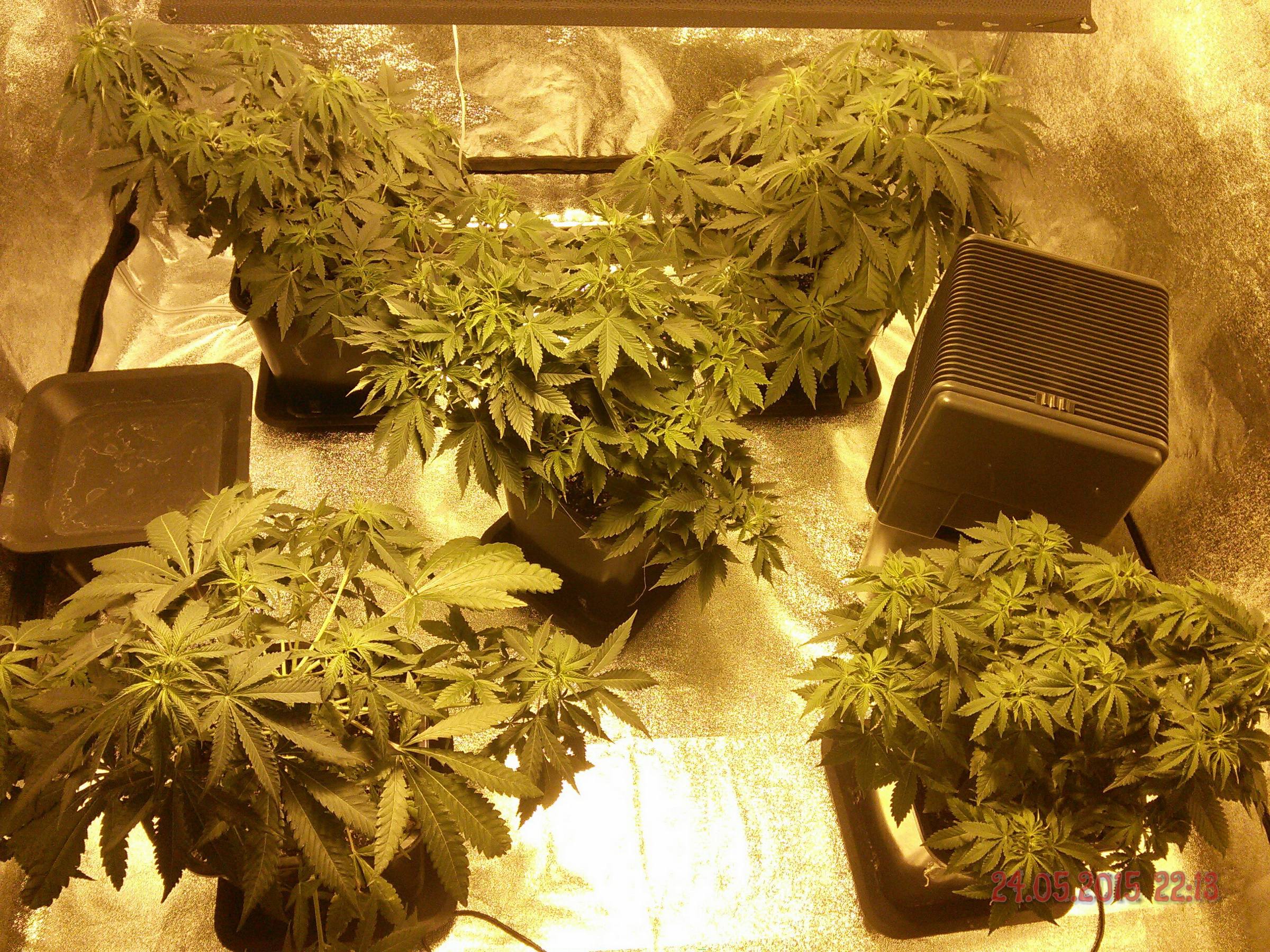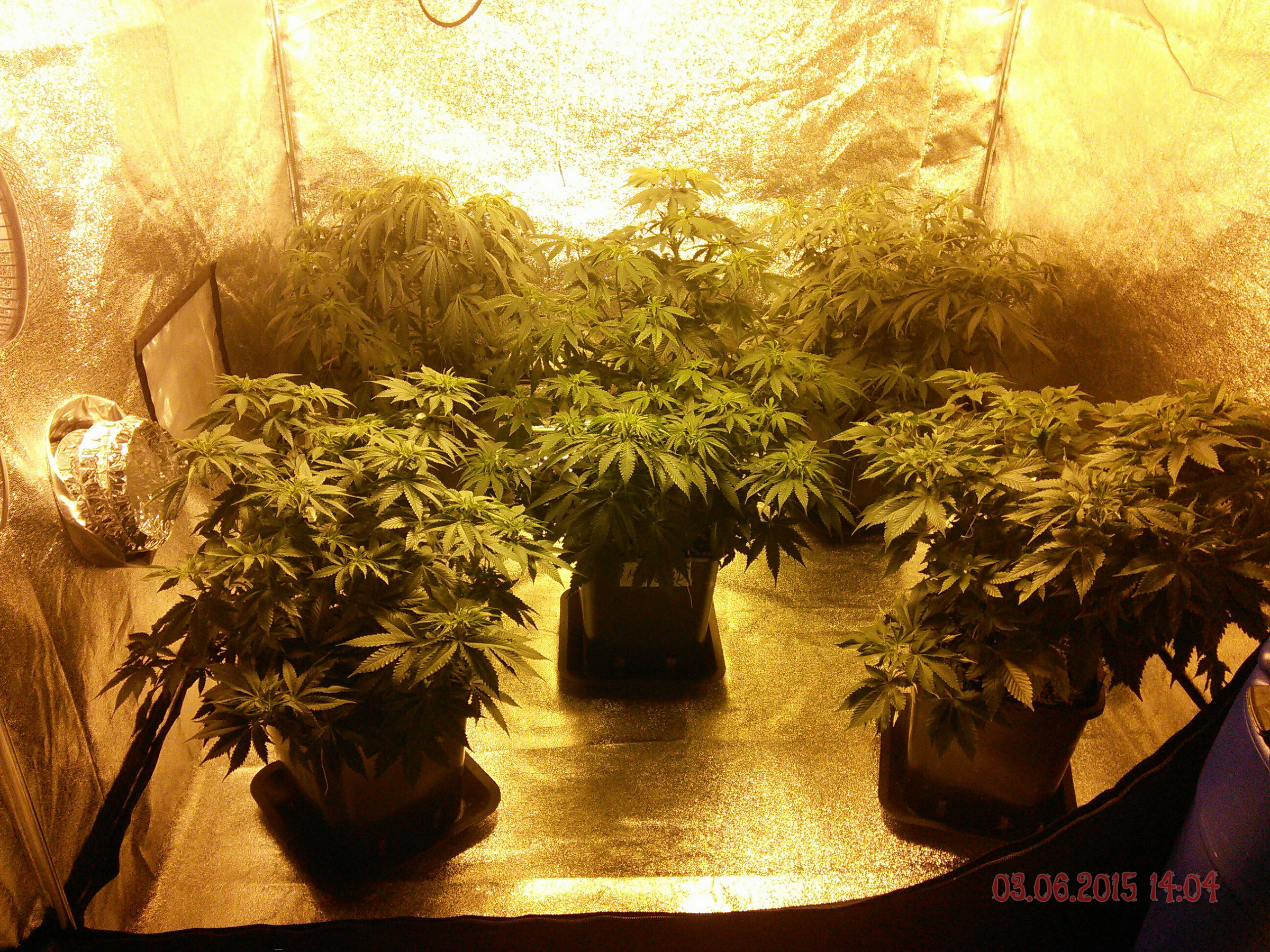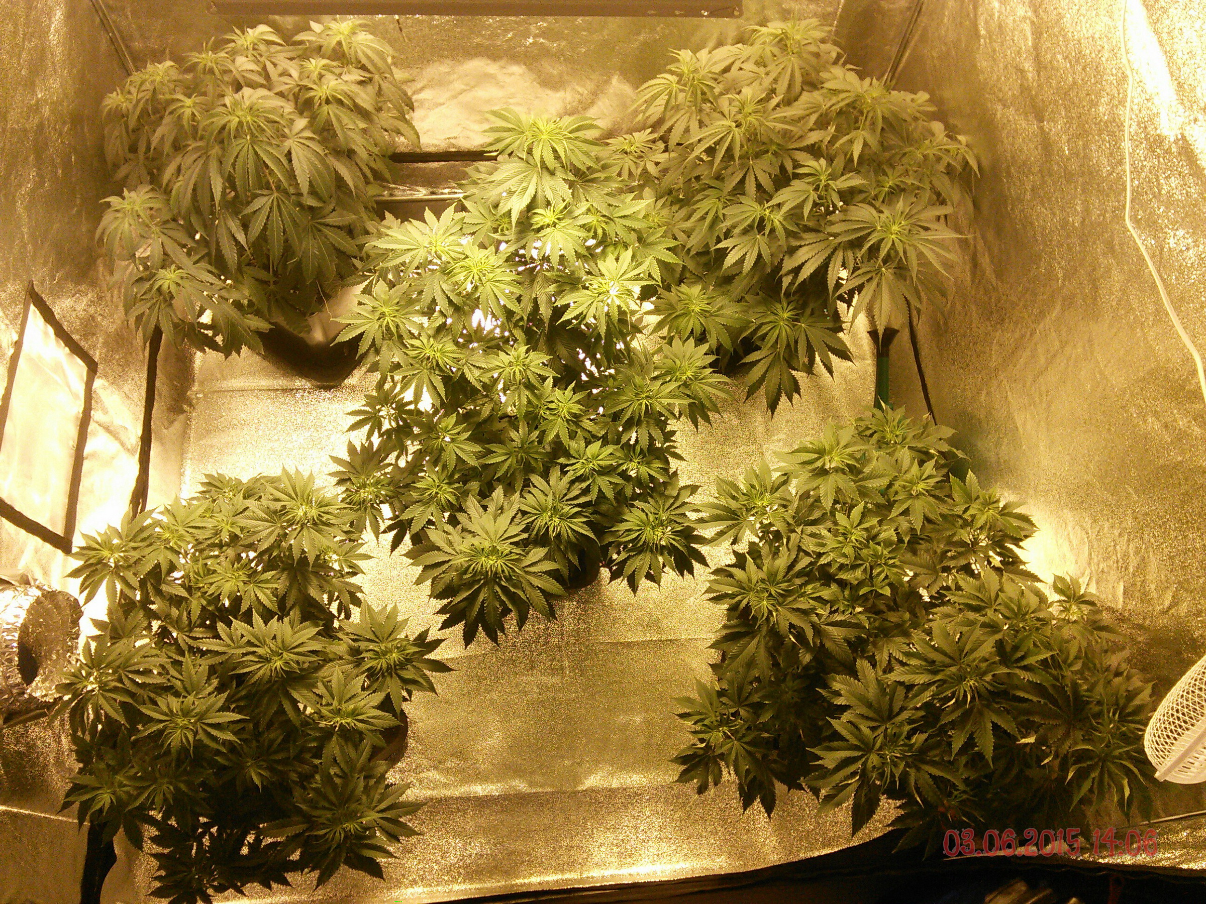 Ahoj kytky uz jsou sice pekny keriky ale na prepinani mas este malo vyplnenej prostor.. a obavam se ze donedele to nedoroste... zkus trosku kytky roztahat neni dulezity mit kytky metr vysoky staci 60cm vic ti 600w stejne neprosviti hlavne aby jsi mel dobre zaplnenej prostor (na zem by nemelo svitit primy svetlo) mozna ze bych dal ty 4 velky do rohu a jednu nechal uprostred myslim ze se ti to pak snaze podari vyplnit. a ty dva prdoly co tam mas ty ti nejspis stejne nedorostou a zustanou ve stinu pod tema velkejma tak si myslym ze sou tam taky zbytecny. jedine to doplnit rozjetejma rezama uz prokorenejma v hline nejaky extra tahavy genetiky ty by to po prepnuti mozna dojeli... pomatuj cim mene postranich vetvi tim vice se ti kytka po prepnuti vytahne a naopak alespon u 95% vsech strainu co my prosli rukama to tak bylo.